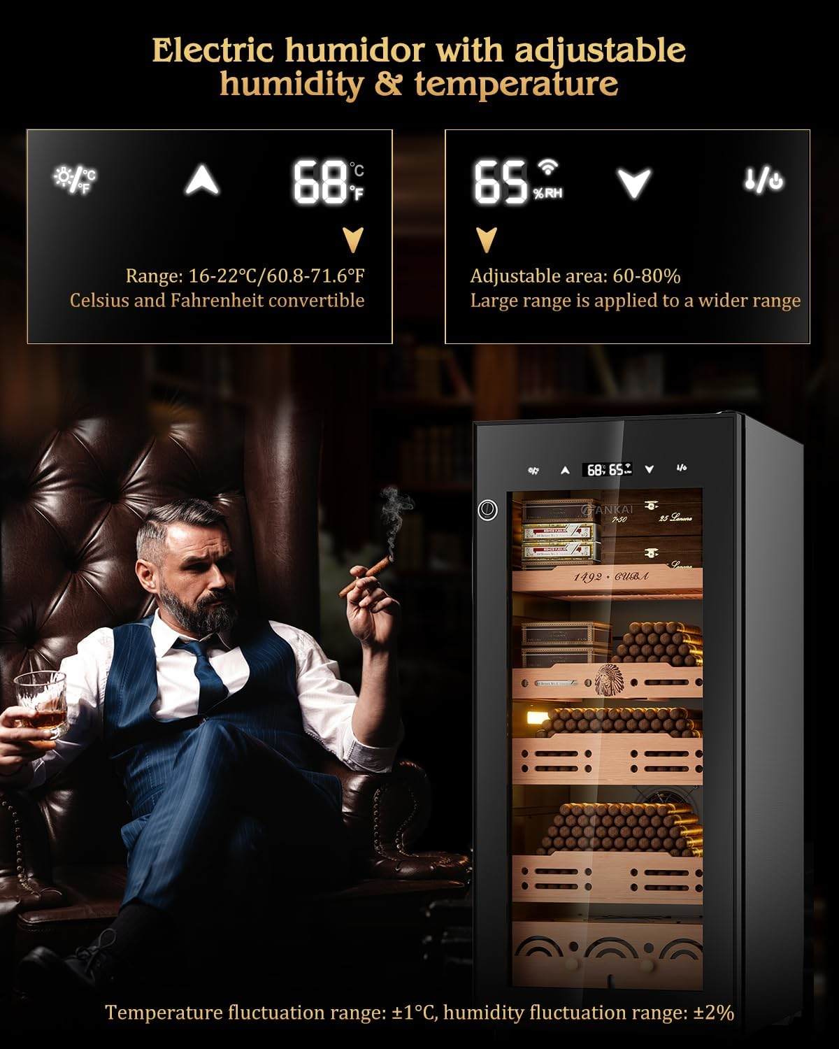 Equipped with a high-performance compressor, this electric cigar humidor rapidly cools to your desired temperature (64â68°F / 18â20°C) in about one hour. The built-in circulating water tank and fan maintain steady humidity at 65â70% RH, with minimal fluctuation (±1°C / ±2% RH) after setupâkeeping your cigars perfectly preserved at all times.