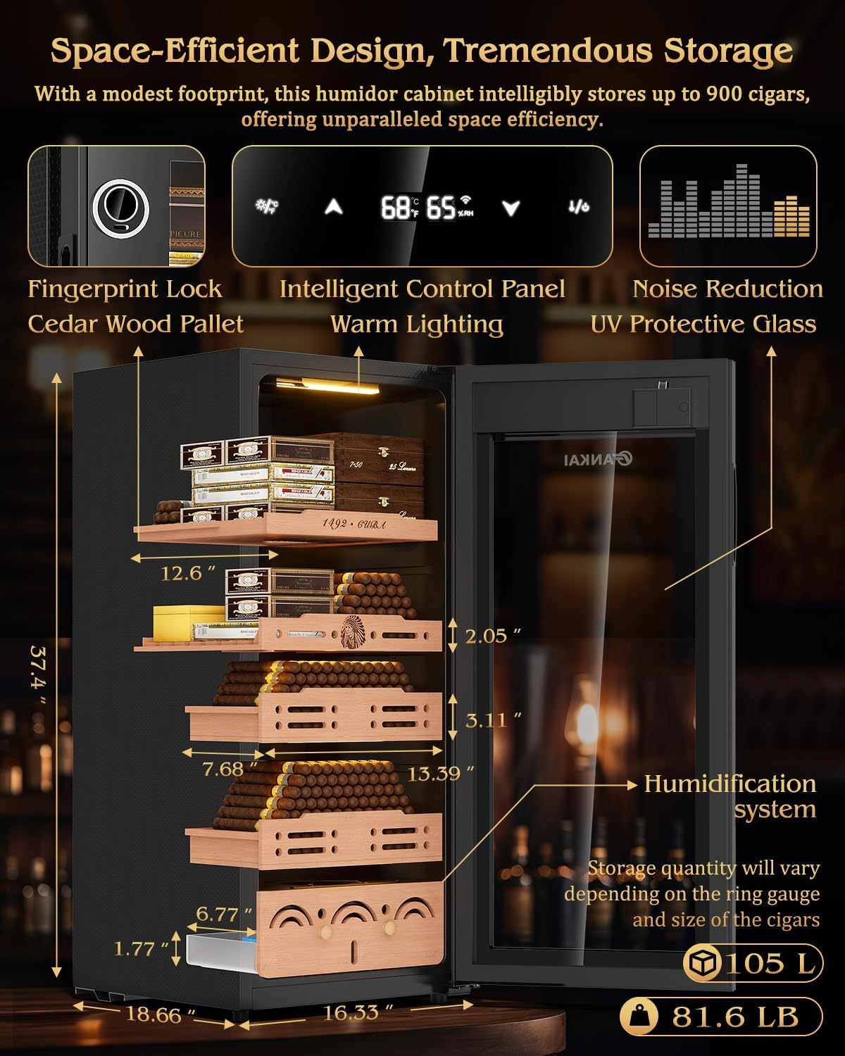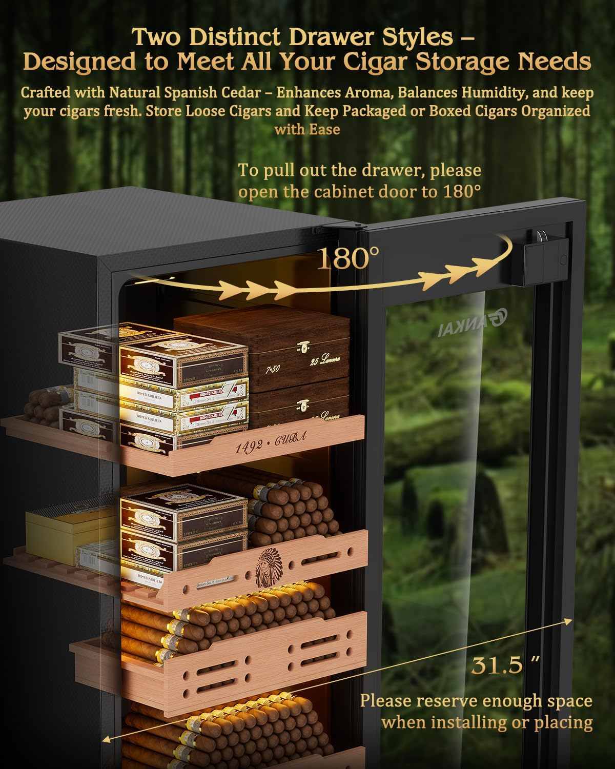 Store up to 900 cigars inside 4 removable Spanish cedar drawers, designed to hold loose cigars or entire boxes. The natural cedar enhances aging, neutralizes odors, and prevents drying. Removable trays also allow flexible use as a mini beverage refrigerator for whiskey, wine, or sodaâoffering versatility beyond cigar storage.