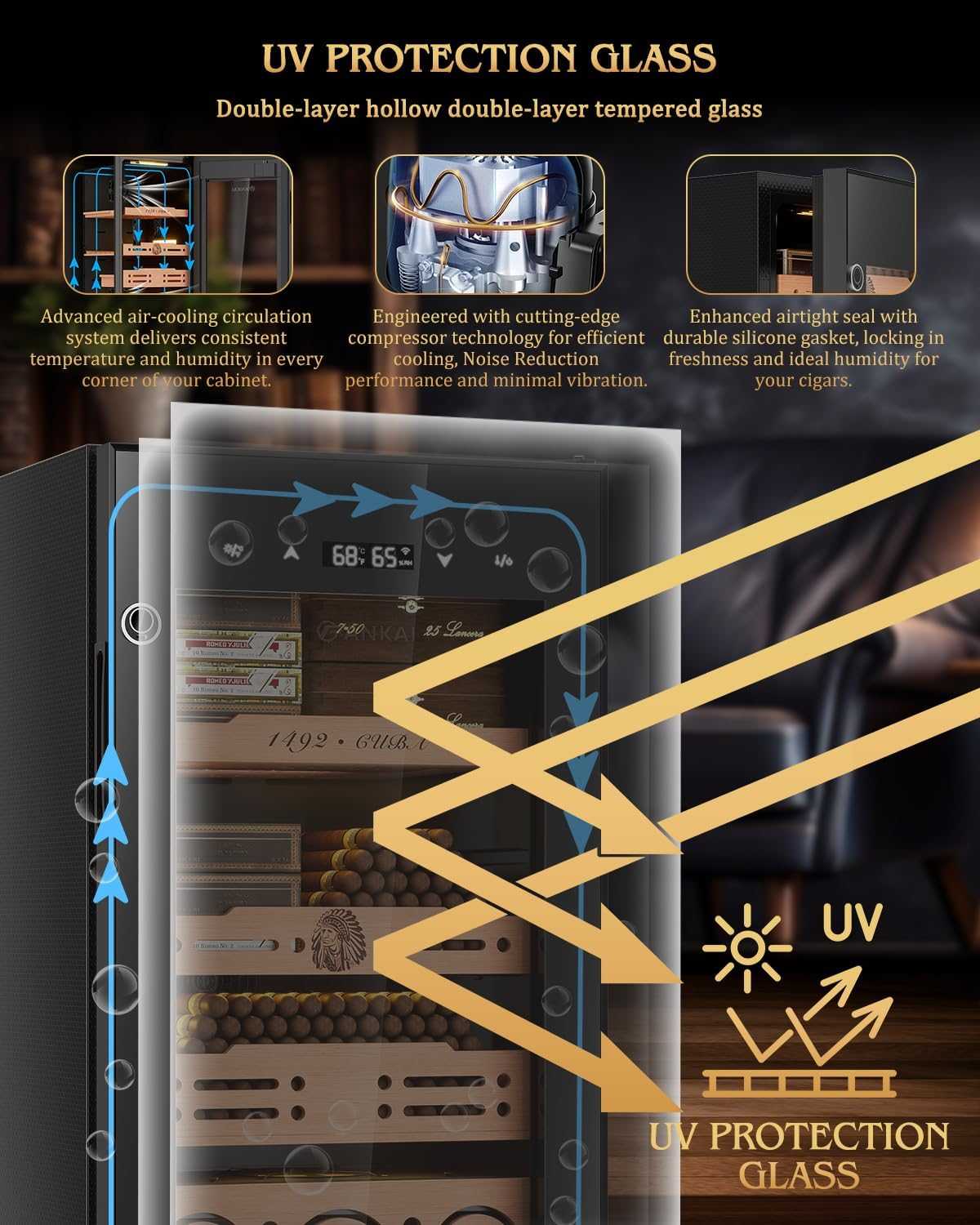 The double-pane tempered glass door provides superior insulation and UV protection, while the low-decibel compressor ensures quiet performance. Every 12 hours, the humidor automatically runs a 5-minute ammonia removal cycle, refreshing the internal environment for a smoother, cleaner cigar experience.