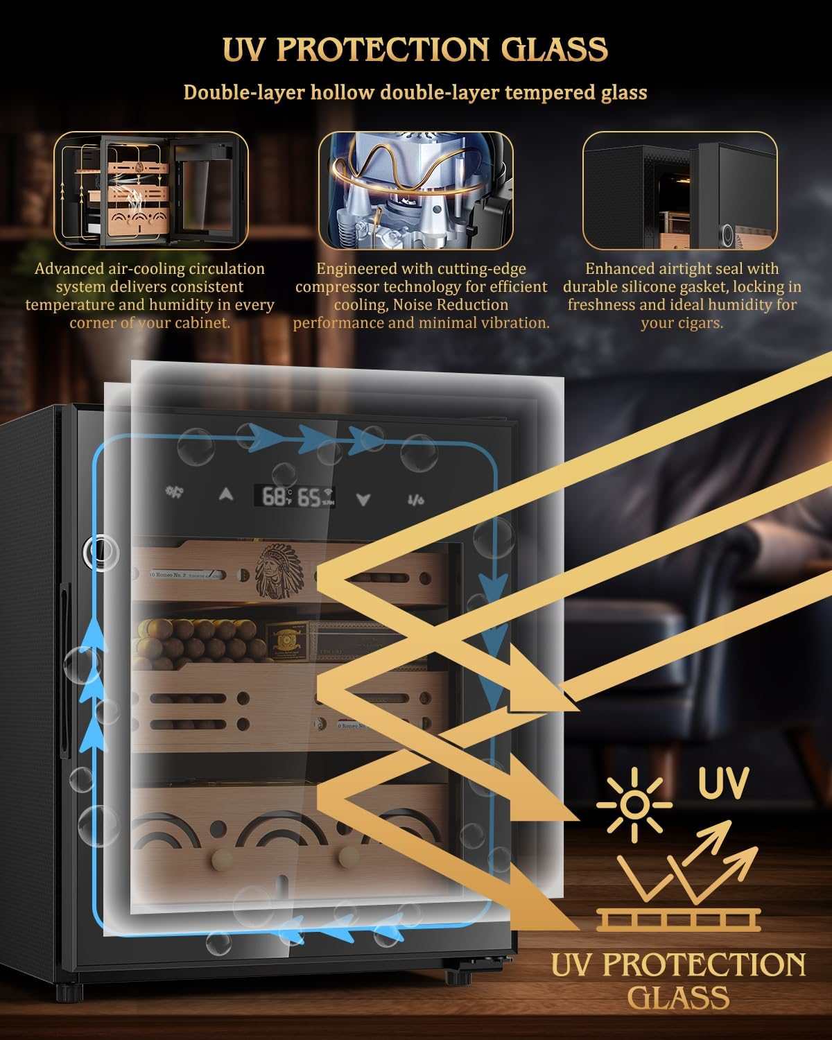 The double-pane tempered glass door provides superior insulation and UV protection, while the low-decibel compressor ensures quiet performance. Every 12 hours, the humidor automatically runs a 5-minute ammonia removal cycle, refreshing the internal environment for a smoother, cleaner cigar experience.