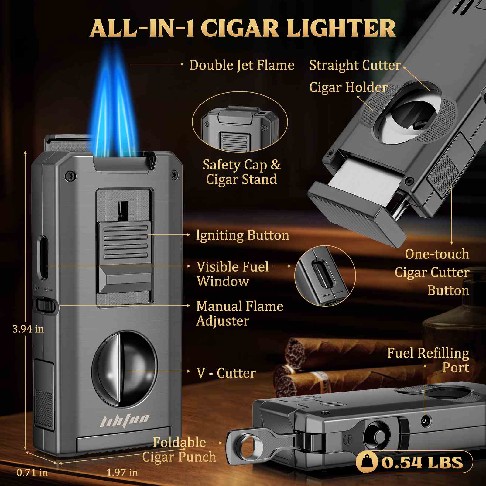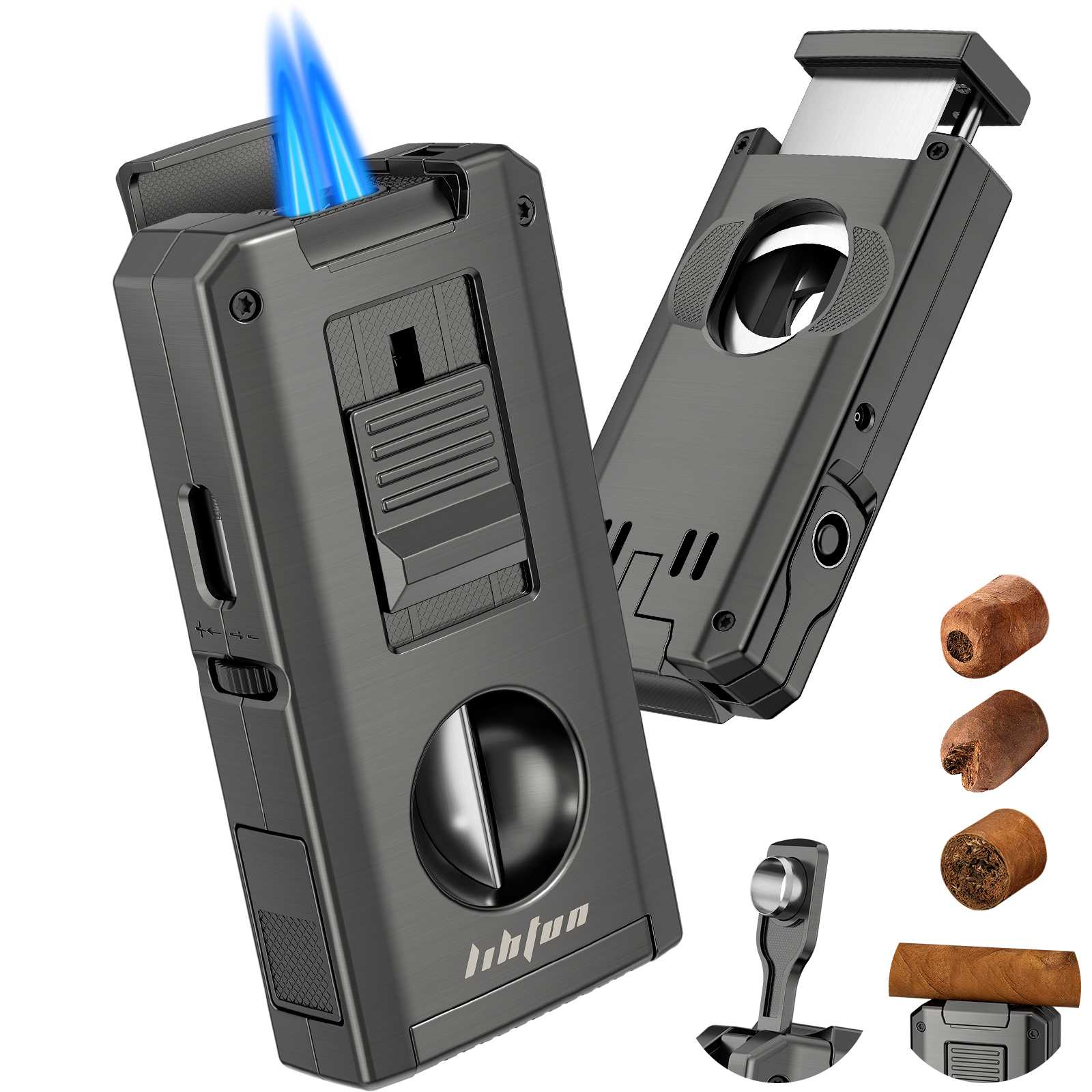 This multifunctional cigar torch lighter combines all essential cigar tools into one compact, travel-ready device: a powerful dual-flame lighter, 2 cigar holders, a foldable cigar punch, and one-touch V-cut & straight cutters. Designed for convenience and performance, it offers a smooth lighting and cutting experience whether you're at home, traveling, or enjoying cigars with friends.