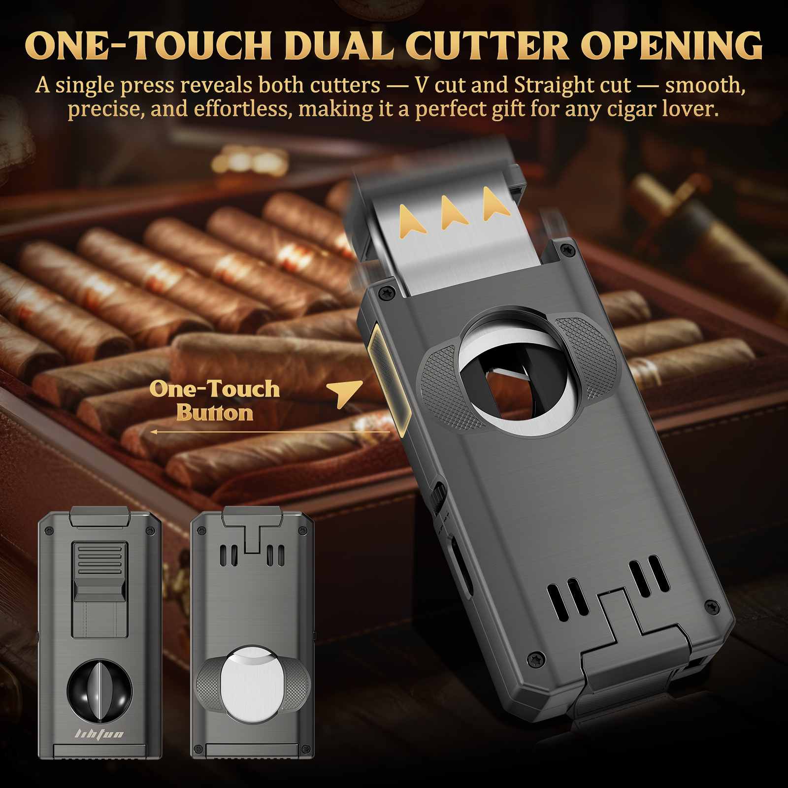 Featuring an innovative one-touch dual-cutter mechanism, this lighter lets you switch between a V-cut (front) and a straight cut (back) with a single press of the right-side button. Enjoy clean, precise cuts every time—perfect for cigar lovers who want fast, effortless operation in a space-saving design.