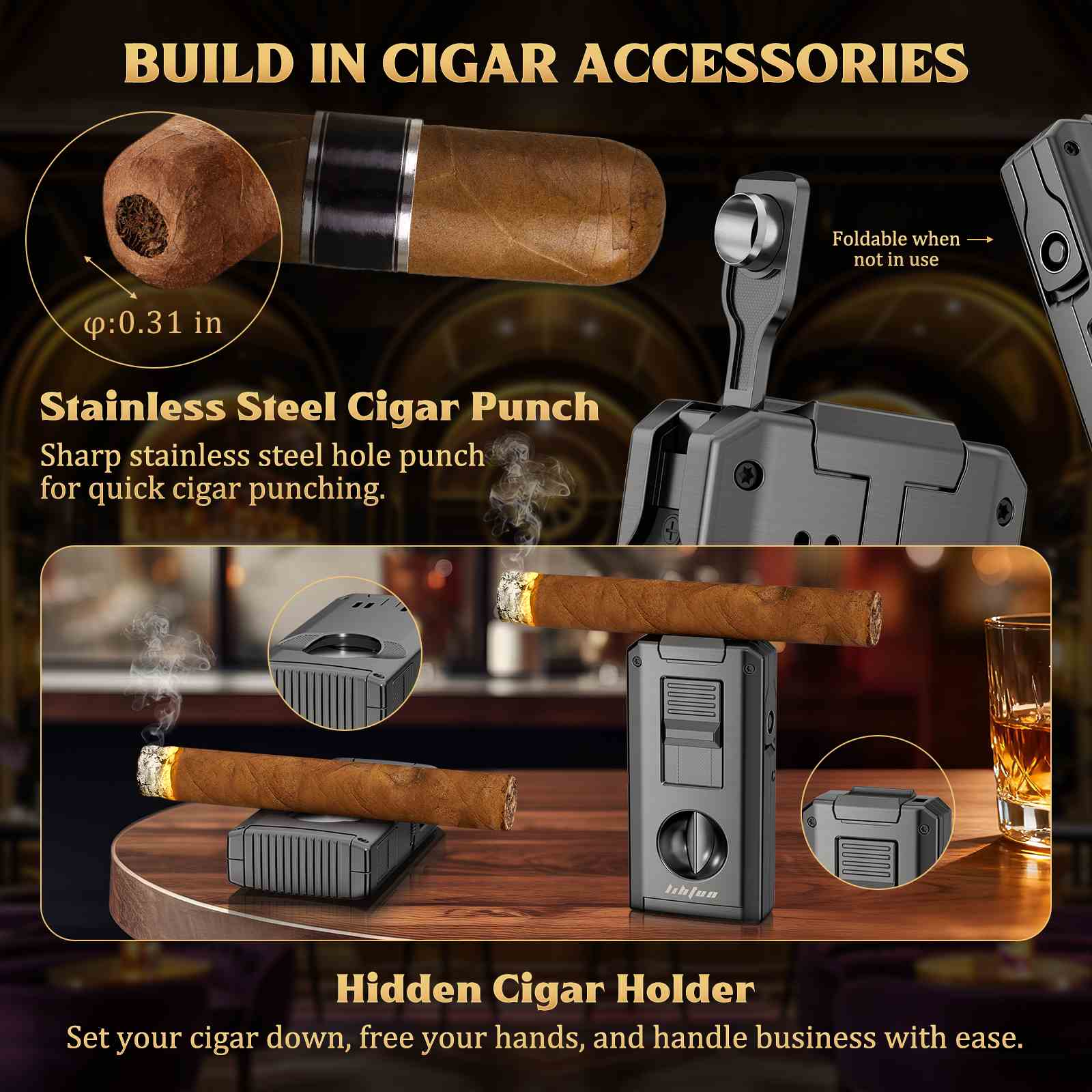 🔥 [Built-in Cigar Punch & Cigar Stand]