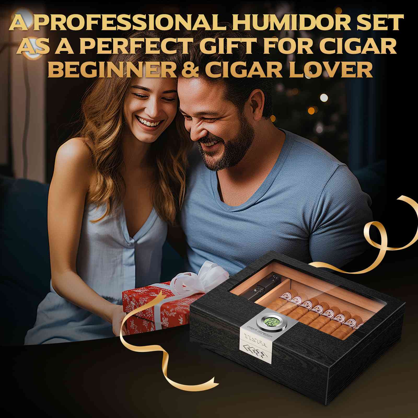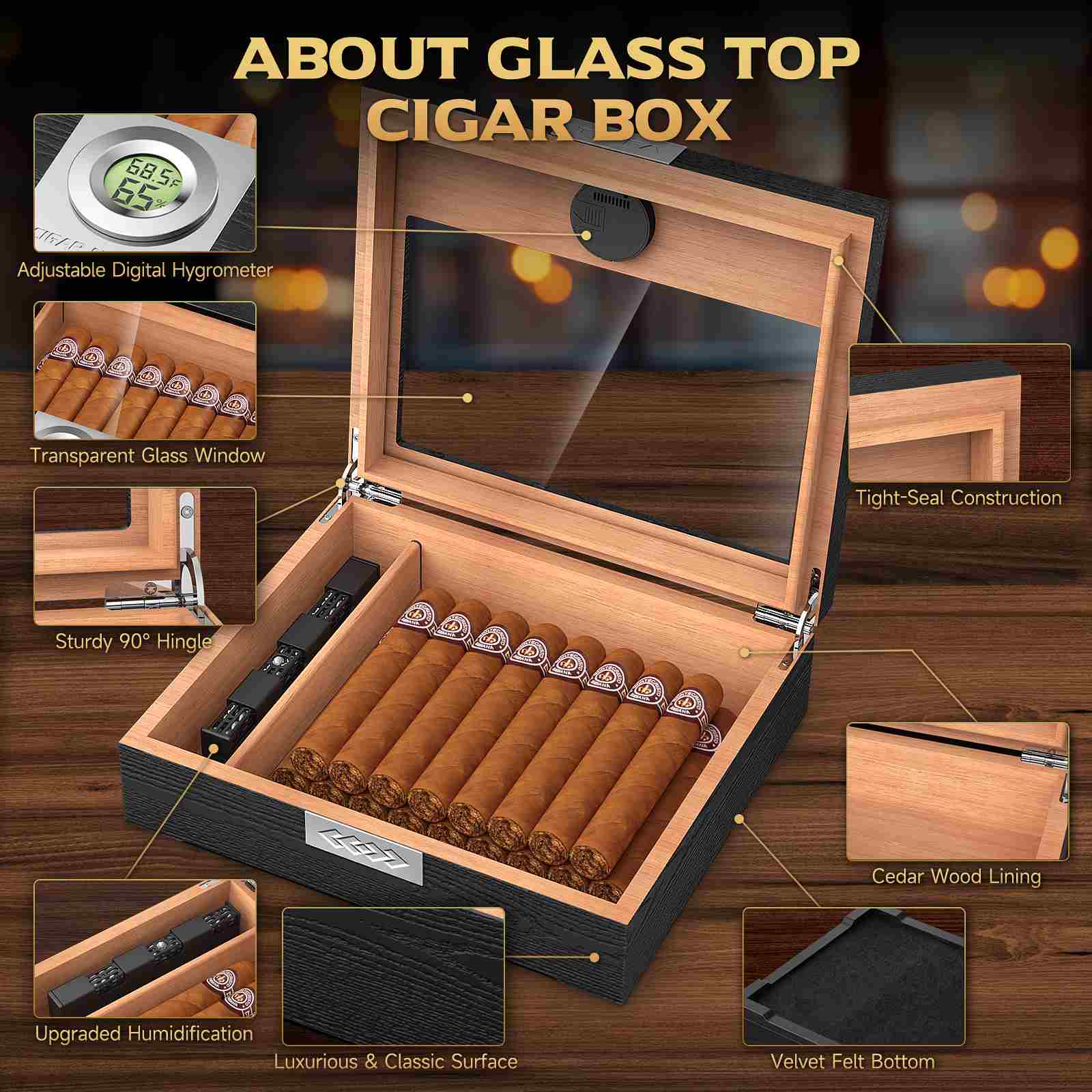 Made from premium natural cedar wood with a smooth, fade-resistant finish, this cigar humidor offers both elegance and durability. The tempered glass lid provides a clear view of your collection without opening the box. Measuring 10.24 Ă 8.66 Ă 2.76 in, it stores 25â35 cigars (depending on ring gauge). The removable divider lets you organize different cigar types with easeâperfect for aficionados who value order and style.