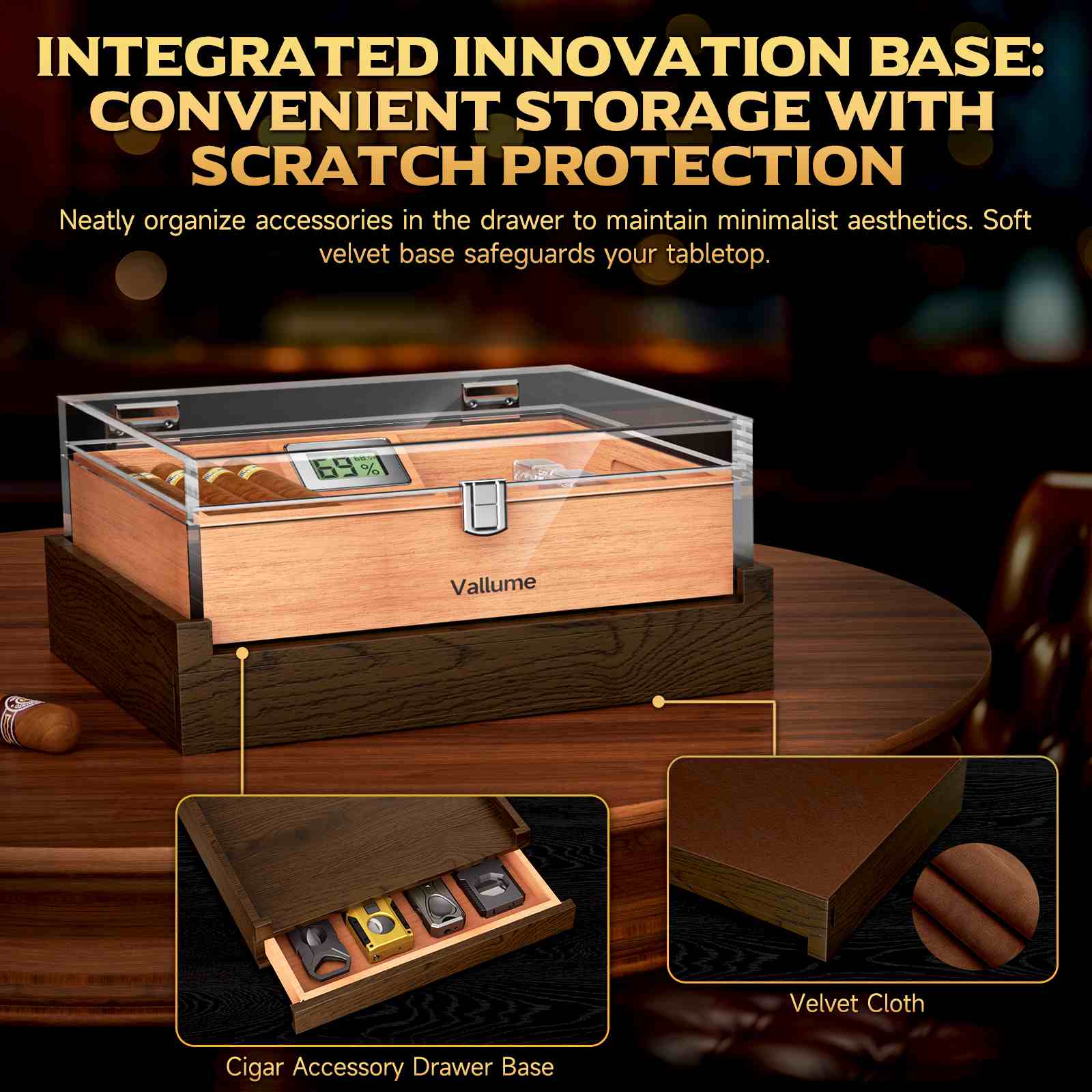 Features an integrated Spanish cedar tray that promotes even humidity circulation while enriching your cigarsâ flavor and aroma. The cedar base includes a sliding drawer for convenient storage of cigar lighters, cutters, and other essentials, keeping your setup organized and sophisticated.