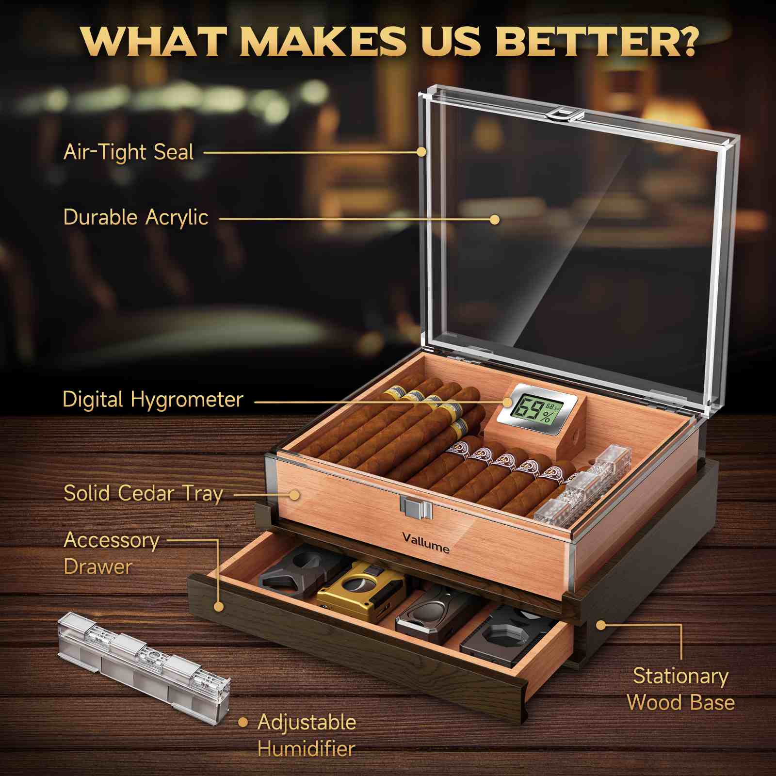 Includes an adjustable gel humidifier strip for precise humidity controlâallowing you to fine-tune surface exposure for stable moisture levels. The built-in digital hygrometer supports ±5% calibration for accurate, real-time temperature and humidity readings. Dual-seal protection with rubber gaskets and a reinforced latch ensures long-term airtight performance to preserve your cigarsâ optimal condition.
