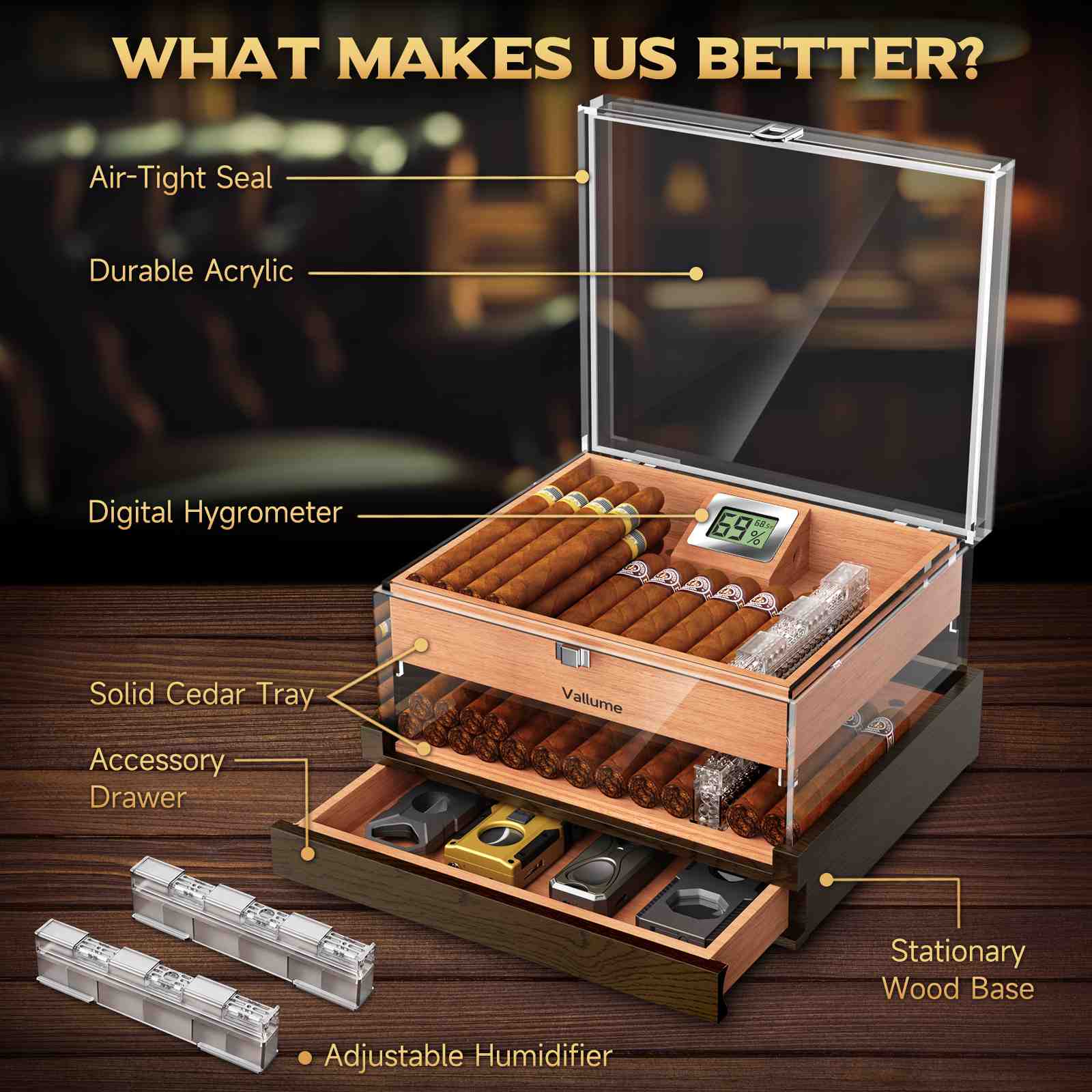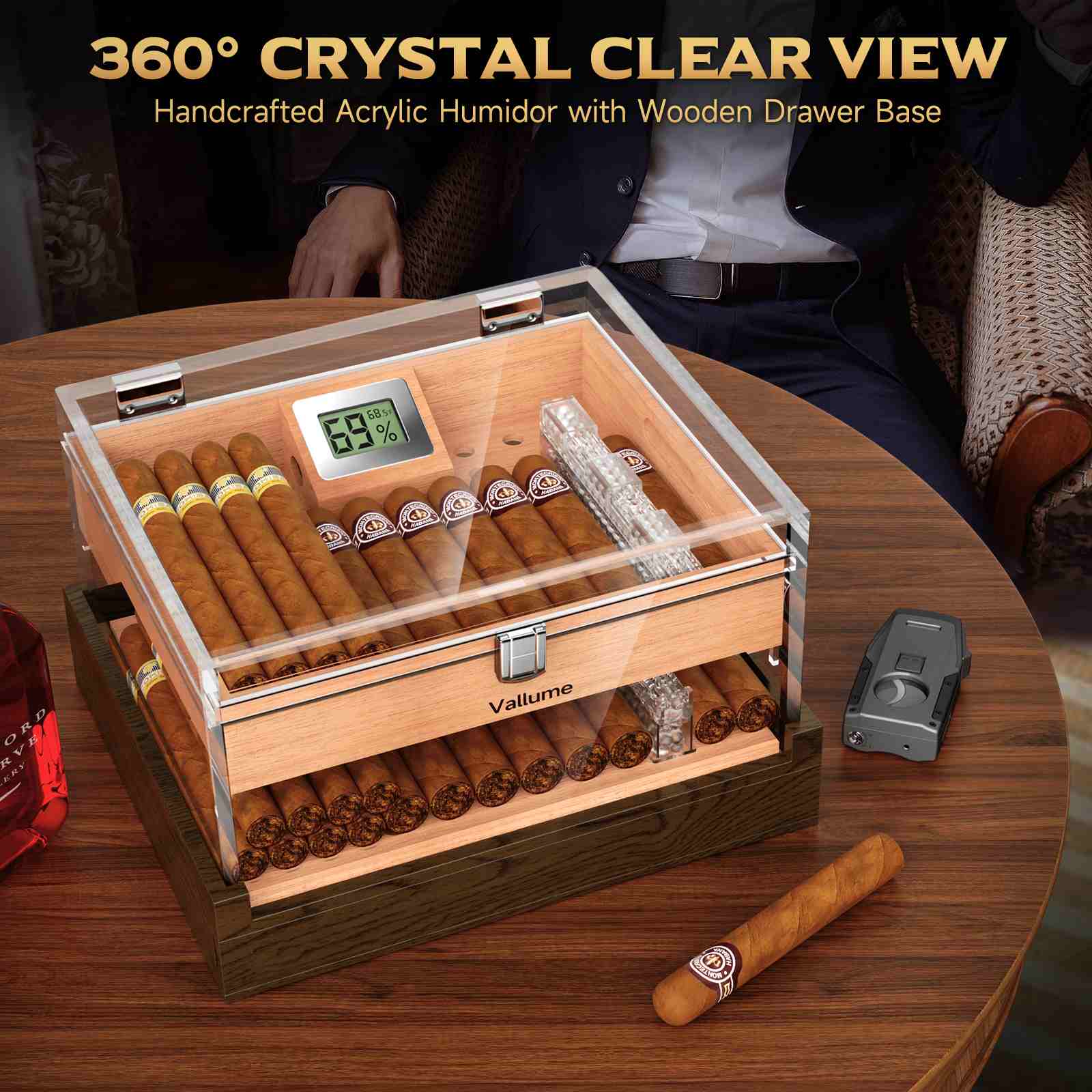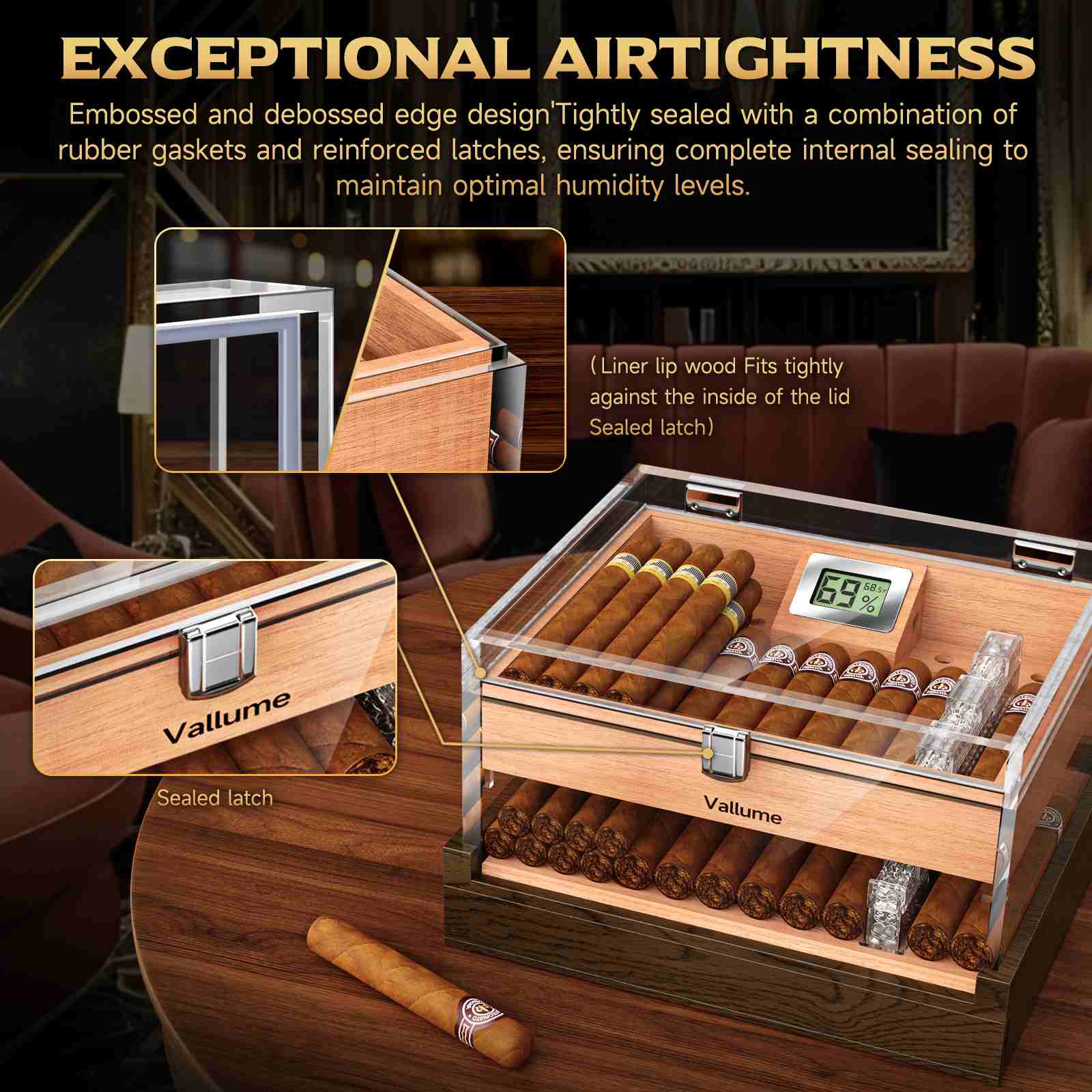 Expertly handcrafted from acrylic and Spanish cedar wood, this humidor combines modern transparency with traditional cigar-preserving excellence. The acrylic walls provide a crystal-clear 360° view of your collection, while the Spanish cedar interior naturally balances moisture, enhances aroma, and promotes even air circulation. Sealing strips along all edges ensure stable humidity retention for long-lasting freshness.