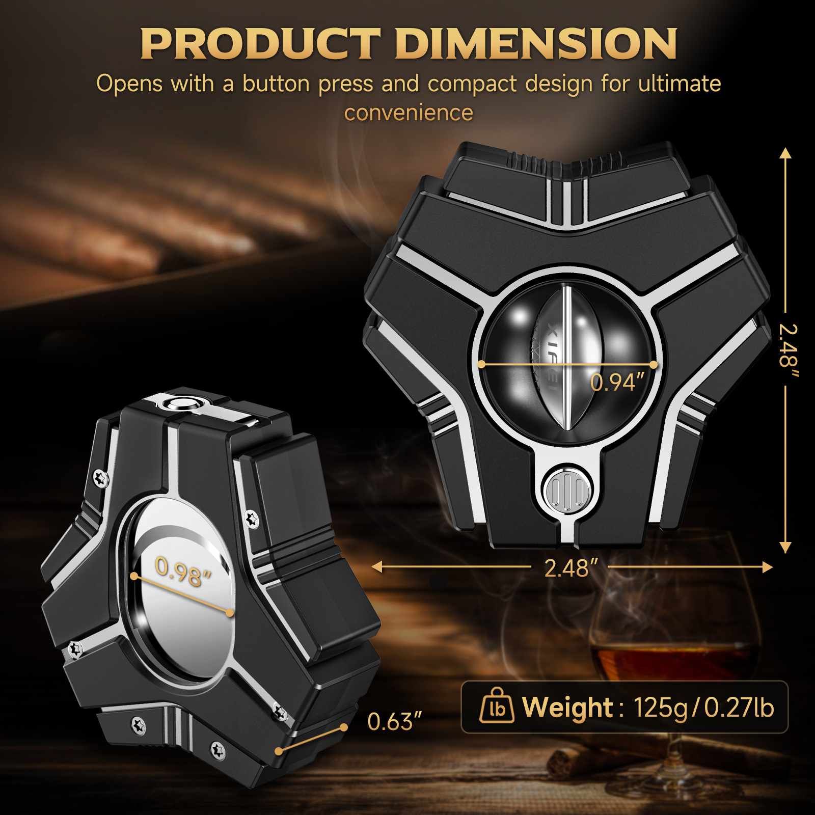 Precision-engineered stainless steel blades deliver clean, consistent cuts without tearing or damaging the cigar cap. The straight cutter accommodates cigars up to 62 ring gauge, while the V-cut is ideal for cigars up to 60 ring gauge. With a simple button press, the cutter opens smoothly for quick and controlled operation